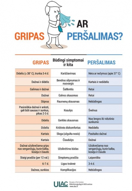 Devynis gripo ir peršalimo simptomų skirtumus rasite plakate “Gripas ar peršalimas?” – plakatas čia.