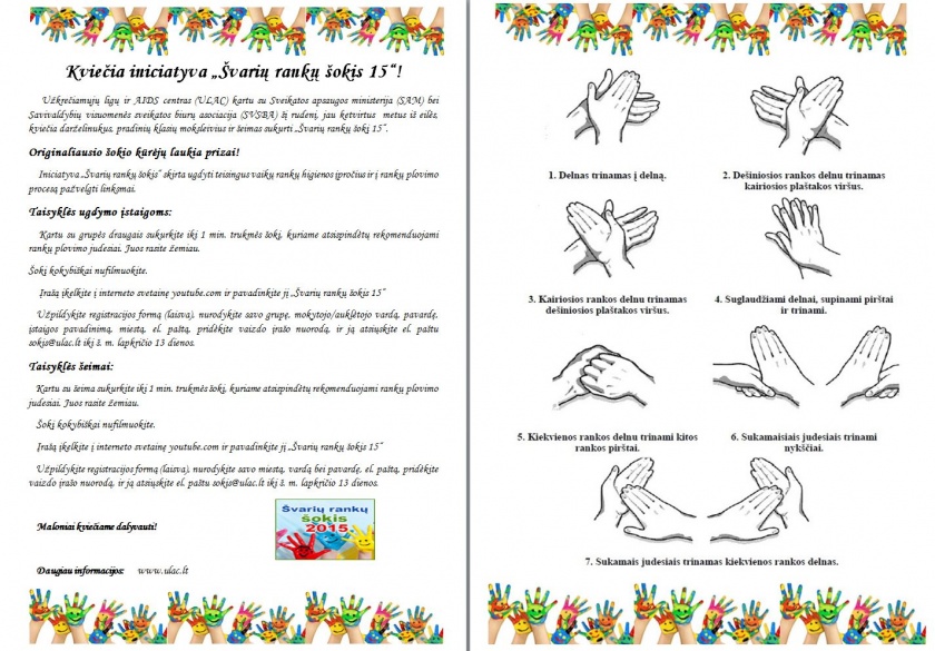 Užkrečiamųjų ligų ir AIDS centras (ULAC) kartu su Sveikatos apsaugos ministerija (SAM) bei Savivaldybių visuomenės sveikatos biurų asociacija (SVSBA) šį rudenį, jau ketvirtus metus iš eilės, kviečia darželinukus, pradinių klasių moksleivius ir šeimas sukurti „Švarių rankų šokį 15“.