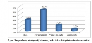 Respondentams tinkamiausias laikas mankštintis – pertraukų metu (52,1%) (žr. 2 pav.). Respondentų nuomone mankštos turėtų vykti kasdien, po 15 minučių.