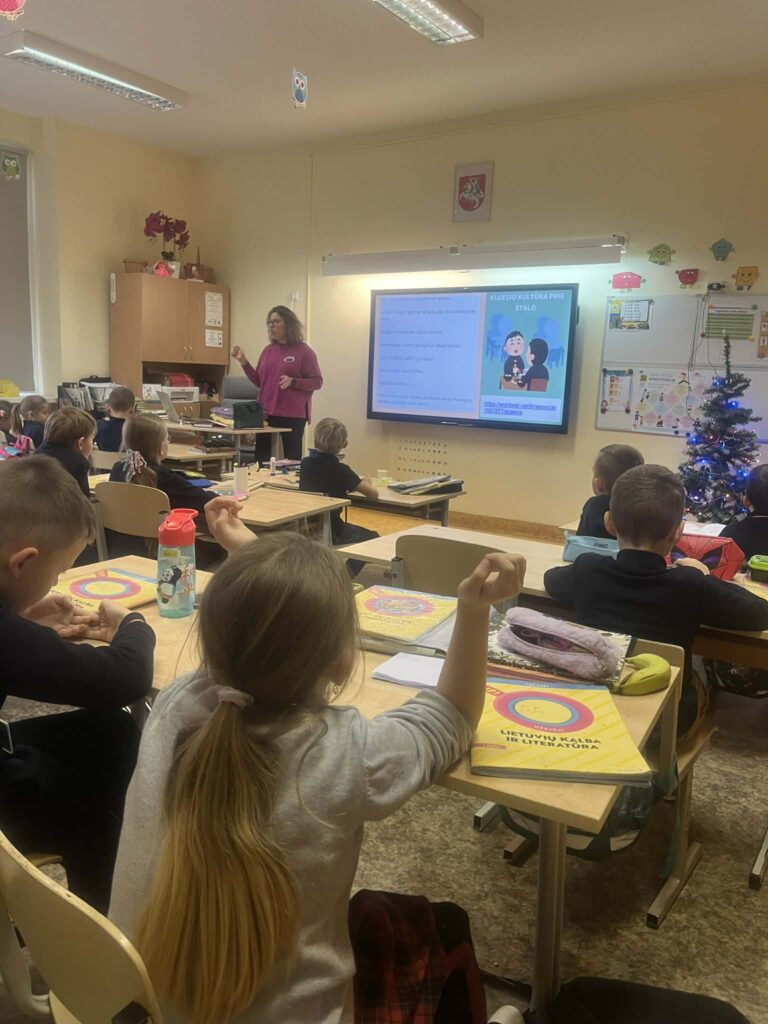 Užsiėmimo pabaigoje mokiniai kalbėjosi apie kultūringą ir pagarbią elgseną. Jie sužinojo, jog mandagumas ir pagarbus bendravimas padeda lengviau sutarti, kuria gerą nuotaiką ir prisideda prie malonios aplinkos.