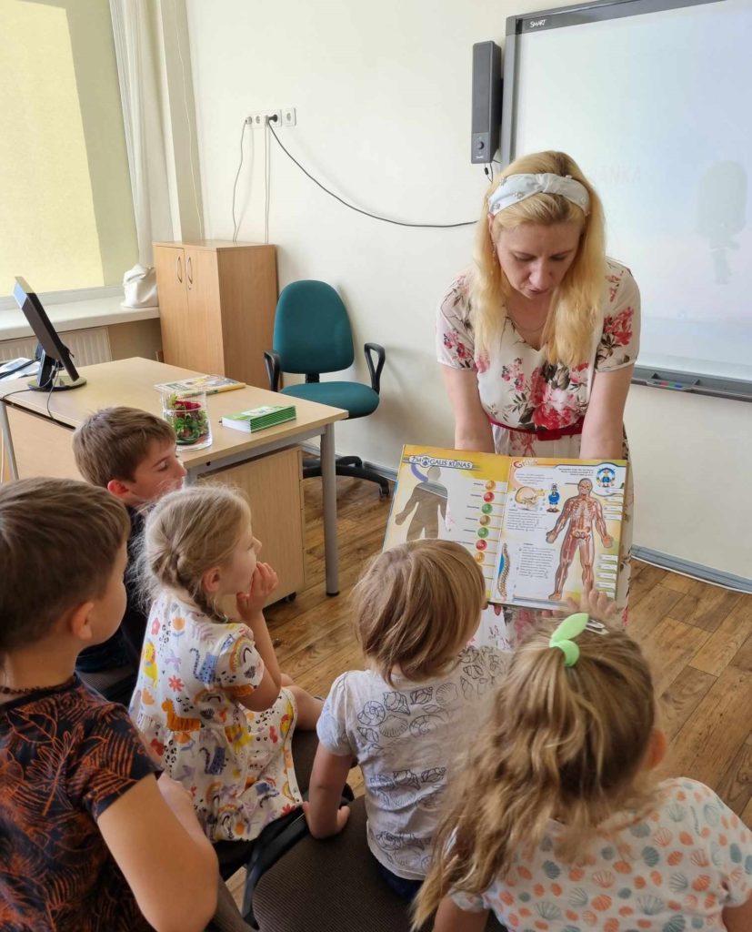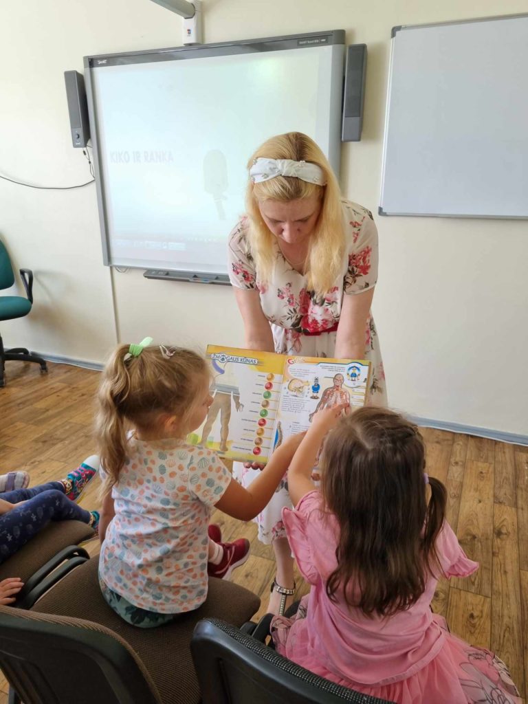 Utenos vaikų lopšelyje – darželyje „Saulutė“ „Žiogelių“ grupėje lankėsi visuomenės sveikatos specialistė Kristina Jasiūnienė. Diskutavo temą: „Kas aš esu?“ Vaikai kartu su sveikatos specialiste praktiškai tyrinėjo žmogaus kūną 5 pojūčių pagalba. Visi kartu diskutavo, kam reikalingos kūno dalys: akys, nosis, burna, ausys, rankos… Skaičiavo, kiek kūno dalių žmogus turi po dvi ir kiek po vieną. Ugdytiniai samprotavo apie kūno priežiūrą ir pagarbą kūnui. Po to, žiūrėdami mokomąjį filmuką „Kiko ir ranka“, diskutavo koks prisilietimas yra geras, o koks – ne. Aptarė tinkamo elgesio ir mandagumo taisykles.