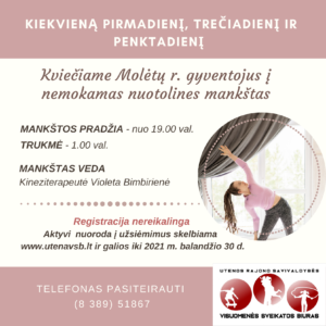 Nuotolinės mankštos Molėtų rajone Prisijungimo nuoroda https://us02web.zoom.us/j/89713240859?pwd=VU1DaHhRcDB6NzJ3VzRUQTJkeFBsZz09 Meeting ID: 897 1324 0859 Passcode: 081580 + Add to Google Calendar + iCal / Outlook export Data Bal 12 2021 Expired! Laikas 19:00 - 20:00 Share this event