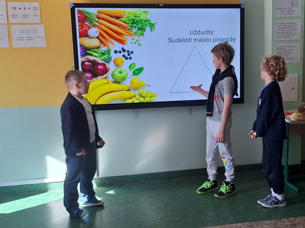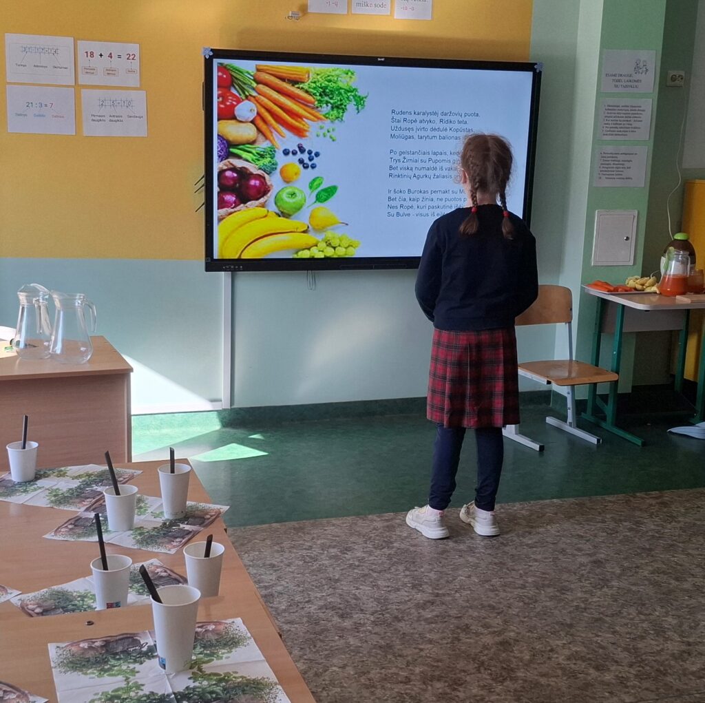 Geras maistas – gera savijauta! Ši smagi veikla skirta pradinių klasių mokiniams, kad vaikai suprastų, kaip valgymas įtakoja sveikatą ir gerą nuotaiką. Mokiniai pradėjo nuo žaidimų apie sveiką mitybą – rūšiavo daržoves, vaisius ir pieno produktus, atpažindami, kas yra „geras“ maistas (pvz., obuoliai, morkos, jogurtas), o kas – ne (saldainiai, gazuoti gėrimai). Vėliau visi kartu sprendė linksmas viktorinas: „Sveika mityba“, „Kas geriausia dantukams?“, skaitė eilėraščius apie vaisius ir daržoves. Taip jie įsiminė, kad daržovės ir vaisiai yra sveikas pasirinkimas ir teigiamas poveikis sveikatai bei stiprina dantis. Mokiniai spaudė sultis iš obuolių ir morkų, jas ragavo, diskutavo kokie vitaminai gyvena obuoliuose ir morkose, prisiminė skaitytus eilėraščius apie daržoves ir vaisius. Ši veikla parodė, kad natūralus maistas suteikia energijos visai dienai.
