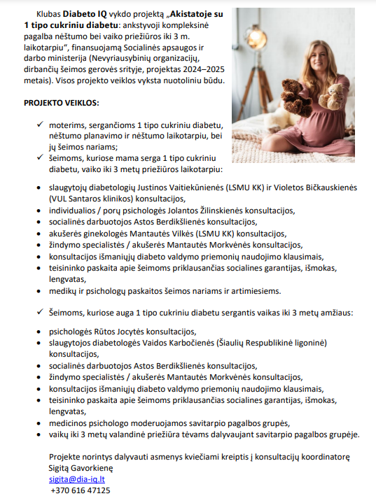 Informaciją apie Klubo 𝗗𝗶𝗮𝗯𝗲𝘁𝗼 𝗜𝗤 vykdomą projektą „𝗔𝗸𝗶𝘀𝘁𝗮𝘁𝗼𝗷𝗲 𝘀𝘂 𝟭 𝘁𝗶𝗽𝗼 𝗰𝘂𝗸𝗿𝗶𝗻𝗶𝘂 𝗱𝗶𝗮𝗯𝗲𝘁𝘂: ankstyvoji kompleksinė pagalba nėštumo bei vaiko priežiūros iki 3 m. laikotarpiu“