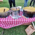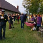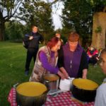 Palikę Vyžuonėlių dvarą, žvyruotu keliu judėjome link Rašės kelio. Bendravome, gyrėme orą, džiaugėmės smagia kompanija. Kirtom Skaistašilio mišką ties Žydų kapinėmis. Nors, išvagoti medžių šakomis, takai ir vertė būti atidžiais, tačiau kelias neprailgo, o net suteikė nepakartojamo žavesio. Išvažiavus į tiesų dviračių taką, vedantį iki Sirutėnu, net nepastebėjome, kaip įsukome į gyvenvietę. Jau nuo kelio matėsi mūsų laukiantys stalai, krosnelė, ant kurios savo šonus šildė moliūgų sriubos puodas. Sutiko smagios šeimininkės, kurios žygio dalyviams ir virė rudeniu alsuojančią sriubą. Jovita ir Rasa kvietė prie stalo, pylė į dubenėlius šiltą viralą. Galima buvo rinktis aštresnį ar prėskesnį variantą. Valgėme, gyrėme ir dar kartojome. Užteko visiems. Net mažieji žygio dalyviai, kurių šiais metais gausiai ,,užderėjo“, gardžiai mėgavosi savo sriuba. Sirutėnų bendruomenės namuose apžiūrėjom tapybos darbų parodą bei vaišinomės arbata, sausainiais, šakočiu.