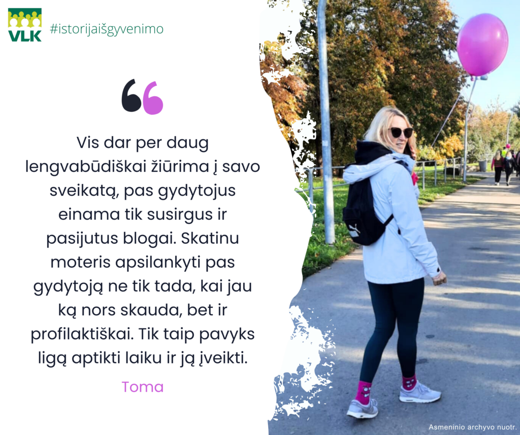 Su onkologine liga Toma susidūrė būdama vos 27-erių. Apsilankyti pas ginekologę paskatino neįprasti skausmai dubens srityje ir, kaip pati sako, vidinė nuojauta, kad kažkas ne taip, kaip visada. „Mano menstruacijos visada buvo skausmingos, tačiau jų metu ėmiau jausti kitokį, neįprastą diegimą, kuris leidosi žemyn nuo juosmens į dubenį. Nenumojau ranka į kūno siunčiamus ženklus ir užsiregistravau pas gydytoją, – pasakoja pašnekovė. – Deja, mano nuojauta pasitvirtino. Dar nebaigusi apžiūros, gydytoja pasakė – „vėžys“.“