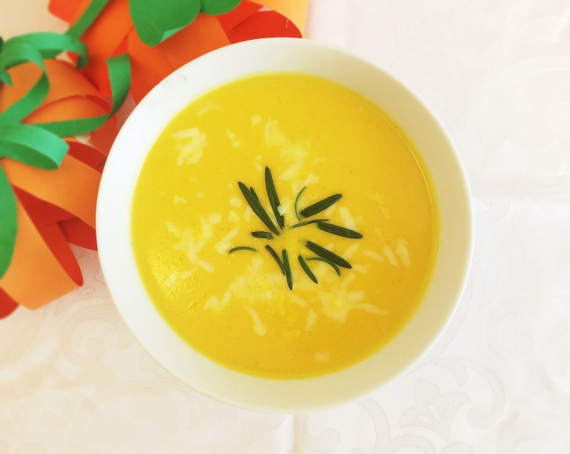 moliūgą nulupti, išimti sėklas, supjaustyti kubeliais. Morkas nuplauti, nuskusti ir sutarkuoti. Svogūną nulupti, supjaustyti. Moliūgų kubelius kepti keptuvėje kartu su morkomis bei svogūnais ir tarkuotomis česnako skiltelėmis. Kol daržovės kepa, į puodą pripilti vandens, bet ne per daug, nes sudėjus daržoves viskas pakils. Į vandenį sudėti 2 vištienos sultinio kubelius, bei nuluptas, nuplautas ir kubeliais supjaustytas bulves. Apkepusias daržoves sudėti į puodą, pavirti, tada supilti grietinėlę, sutrinti viską puode su blenderiu ir dar pora minučių pavirti. Baigus galima valgyti, kad būtų skaniau reikia pabarstyti sūrio, įdėti druskos pagal skonį, ir papuošimui rozmarinas.