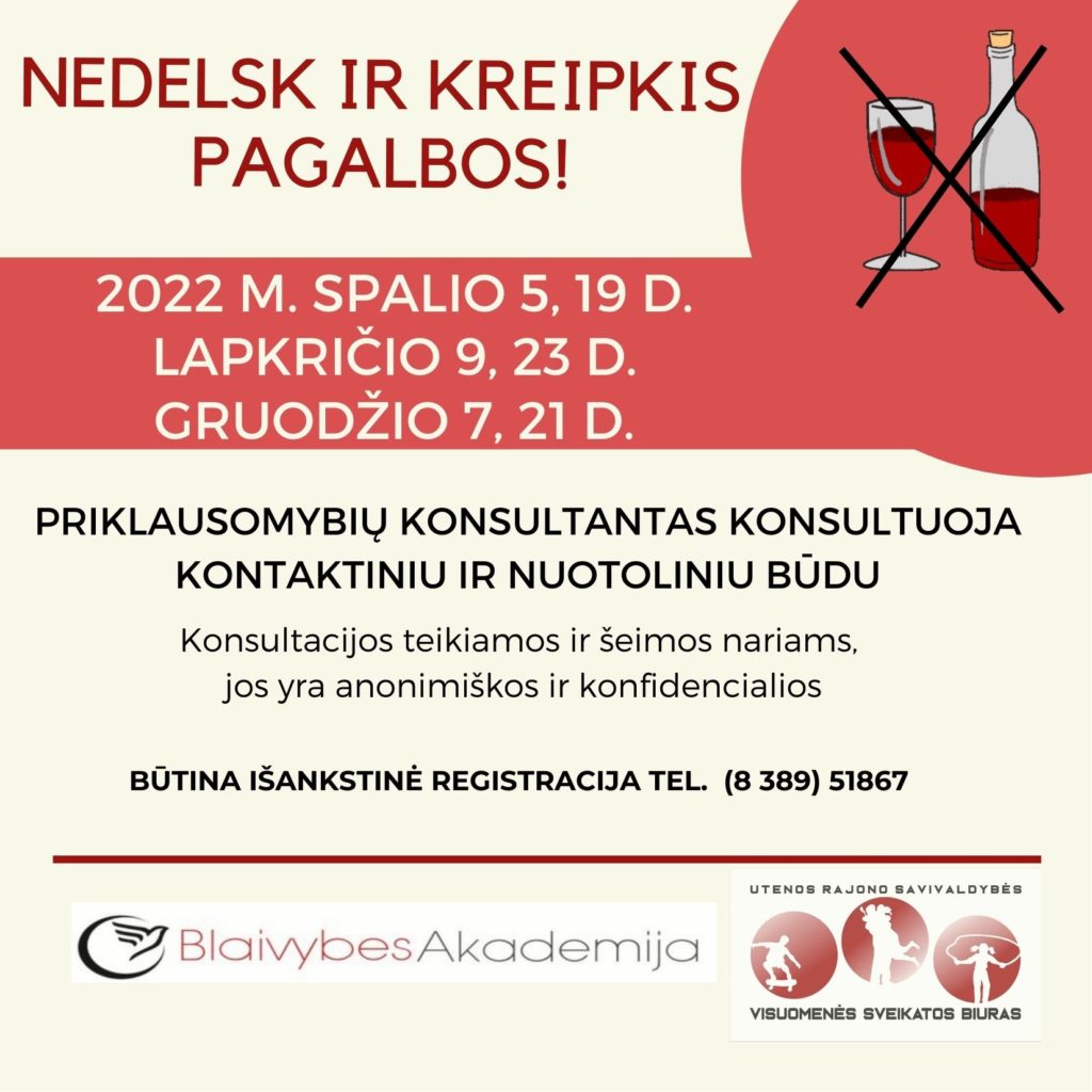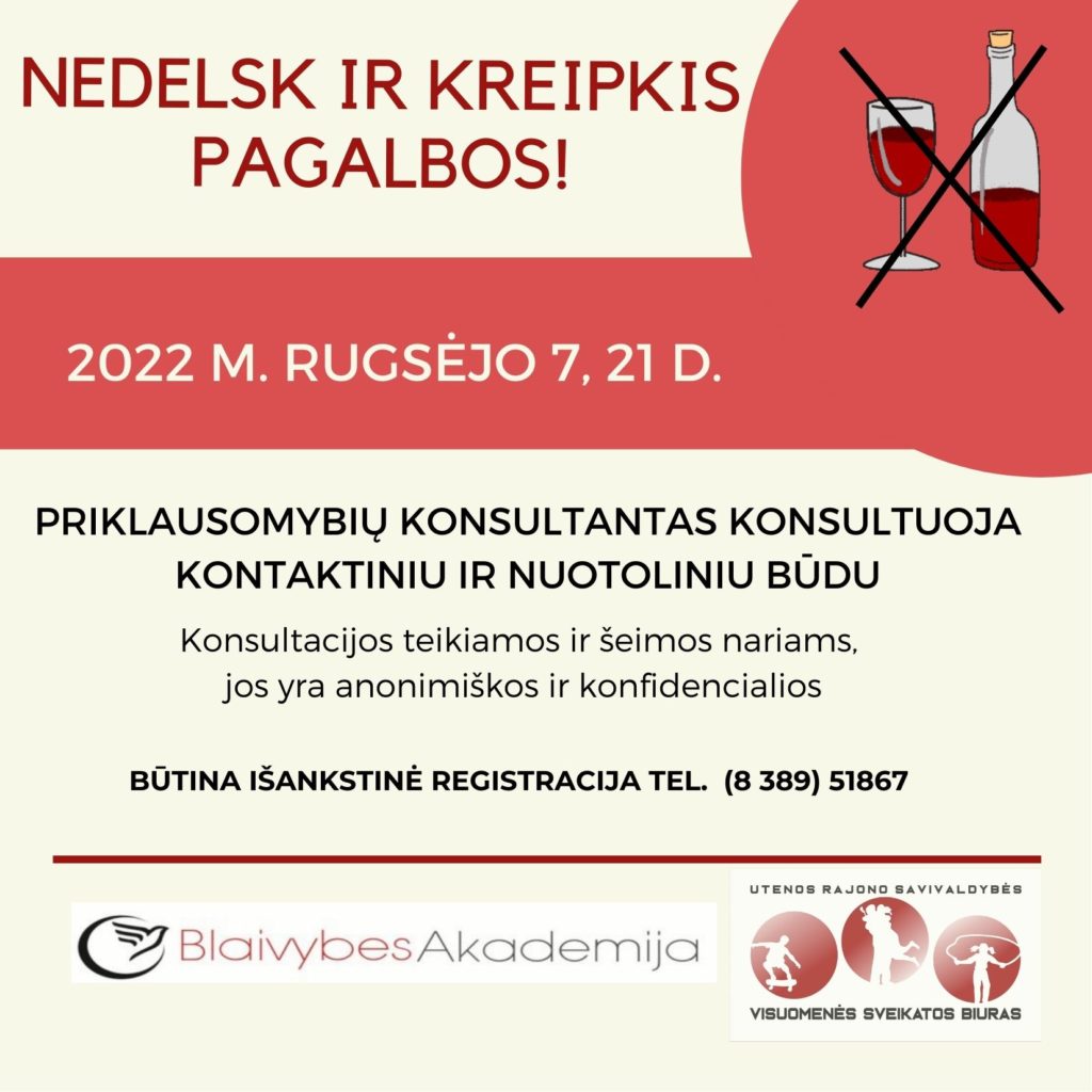 Utenos rajono savivaldybės visuomenės sveikatos biure teikiamos nemokamos anonimiškos priklausomybės konsultavimo paslaugos rizikingai ir žalingai alkoholį vartojantiems asmenims.
