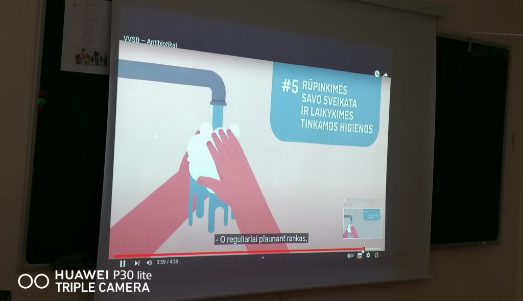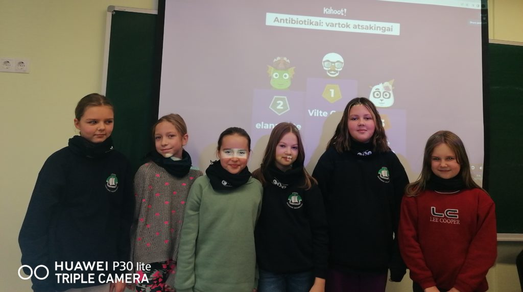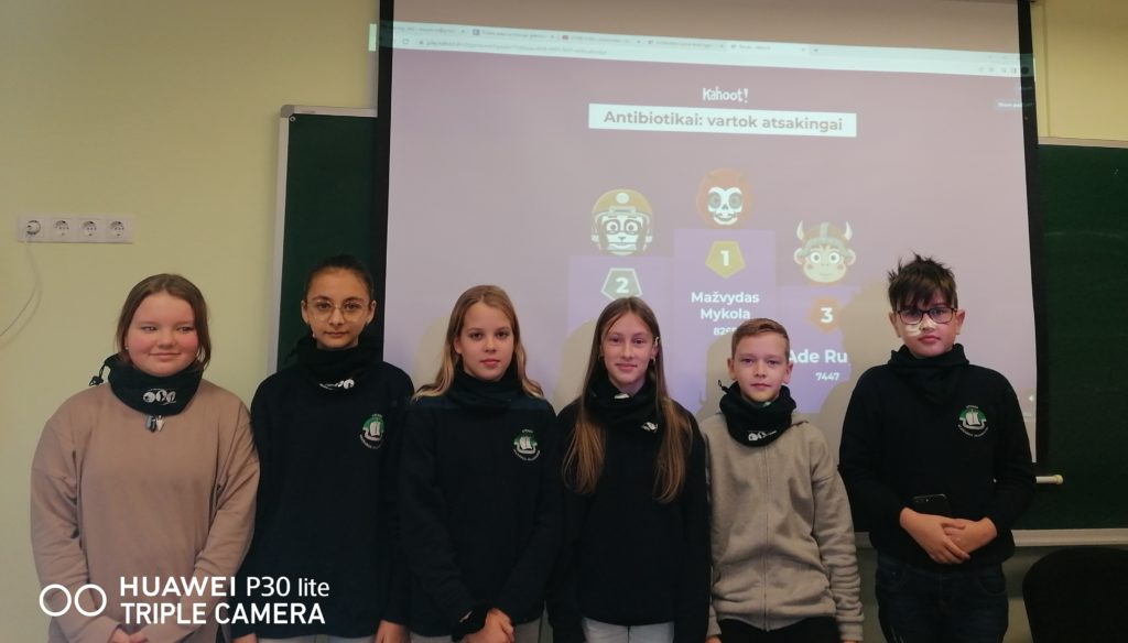Lapkričio 17 d. per žmogaus saugos pamokas visuomenės sveikatos specialistė Sigita su penktų, septintų klasių mokiniais diskutavo apie mikroorganizmų atsparumą antibiotikams. Nors šie vaistai be gydytojo recepto vaistinėse neparduodami, tačiau pasitaiko savigydos atvejų, kai antibiotikai vartojami netikslingai virusų sukeltų ligų gydymui, tokių kaip gripas ar peršalimas, taip pat vartojami netinkamai, kas ilgainiui ir sukelia bakterijų atsparumą antibiotikams. Po diskusijų ir informacinio filmuko ,,Antibiotikai“ peržiūros mokiniai savo žinias įtvirtino žaisdami interaktyvų žaidimą Kahoot! Geriausias žinias pademonstravusiems moksleiviams atiteko mieli ir šilti prizai kakliukai-movos.