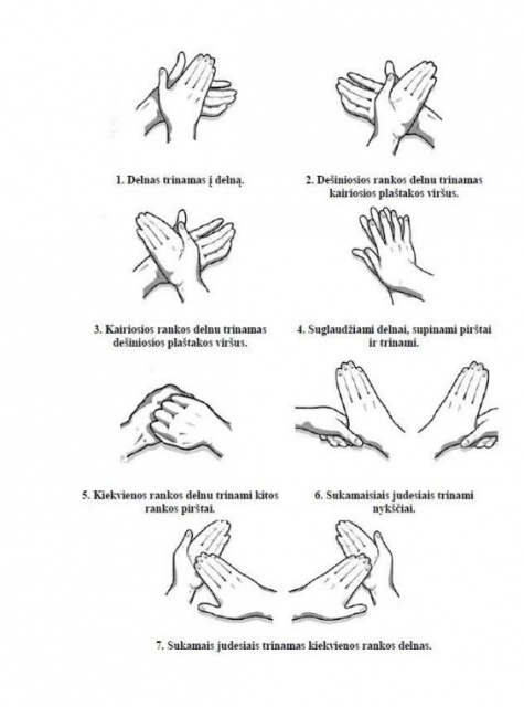 - Kartu su grupės draugais sukurkite iki 1 min. trukmės šokį, kuriame atsispindėtų rekomenduojami rankų plovimo ir kosėjimo judesiai. Juos rasite žemiau.
