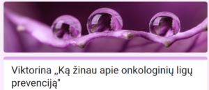 Vasario 4 -oji yra Pasaulinė kovos su vėžiu diena. Siekiant atkreipti visuomenės dėmesį į onkologinių ligų prevenciją bei paskatinti aktyviau dalyvauti prevencinėse programose, kviečiame dalyvauti viktorinoje ir laimėti prizus.
