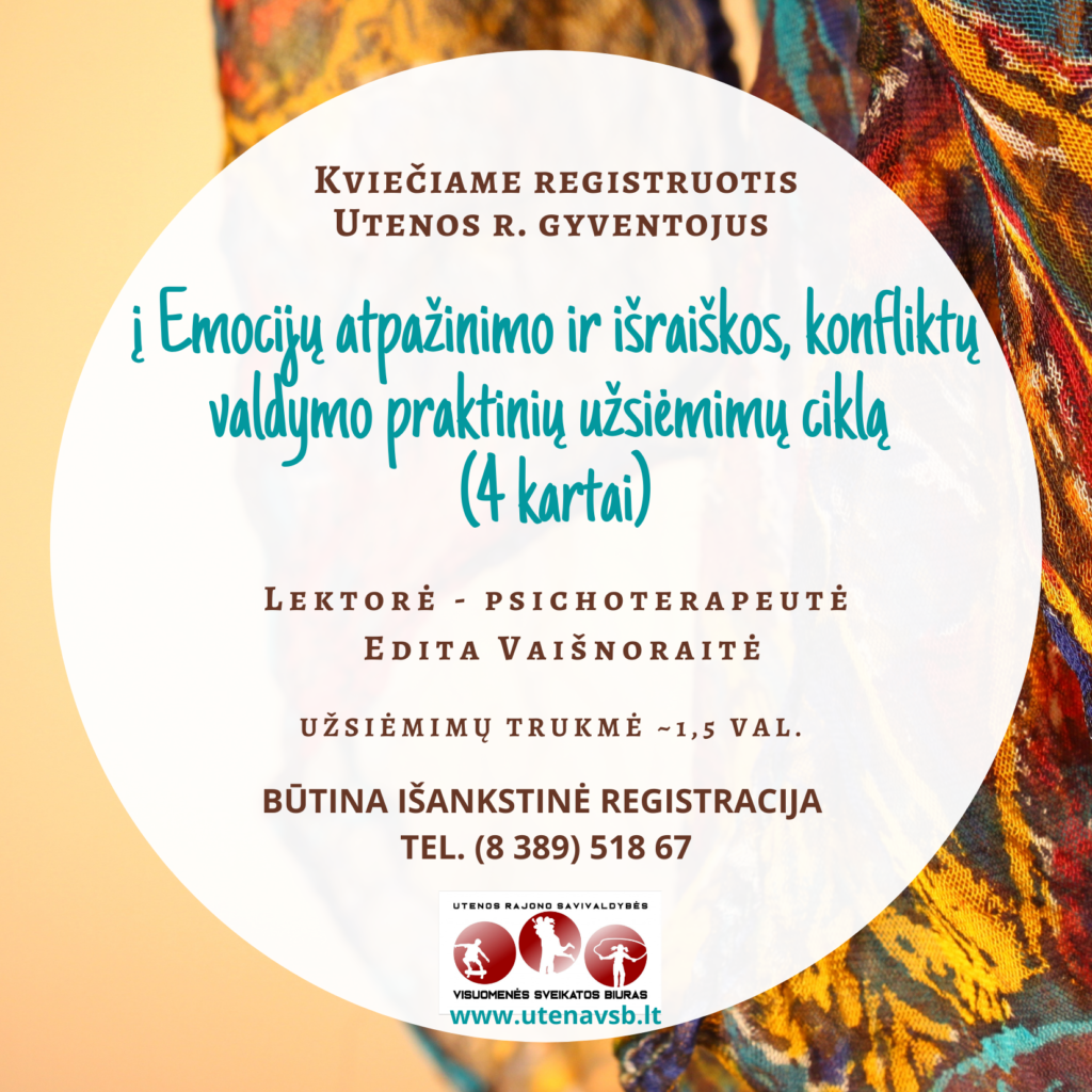 Kviečiame registruotis į Emocijų atpažinimo ir išraiškos, konfliktų valdymo praktinius užsiėmimus tik Utenos r. gyventojams