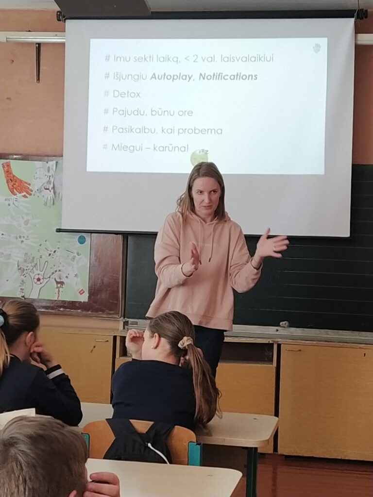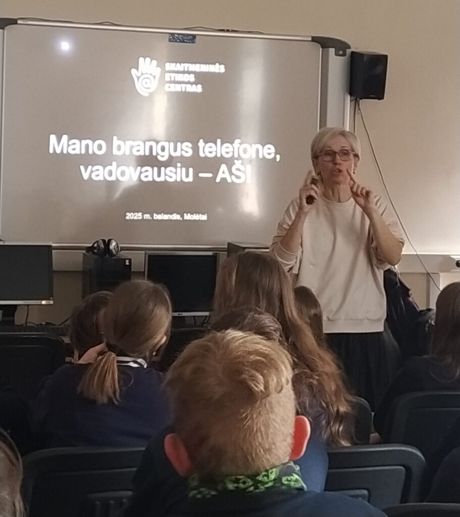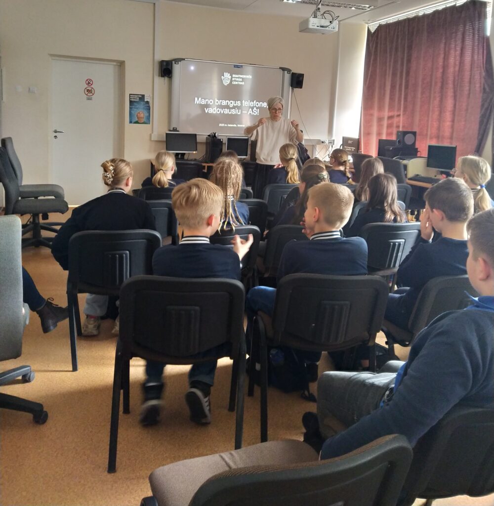 Balandžio 8 d. Molėtų progimnazijoje vyko paskaitos 5-6 klasių mokiniams „Mano mielas telefone – valdau aš!“, kurias organizavo Utenos rajono savivaldybės visuomenės sveikatos biuras. Su mokiniais bendravo VšĮ Skaitmeninės etikos centro lektorės: Rasa Jauniškienė ir Renata Gaudinskaitė. Paskaitų metu mokiniai susidomėję klausėsi ir daug sužinojo: kaip saugiai naudotis telefonu, kaip neviešinti savo asmeninio gyvenimo. Išgirdo patikimos, moksliniais tyrimais grįstos informacijos bei ekspertų patarimų apie tai, kada ir koks naudojimasis išmaniosiomis technologijomis yra naudingas, o kada – gali kelti grėsmę jų fizinei ar psichikos sveikatai, jų saugumui ar reputacijai. Nors nustatyta, kad vien buvimas šalia mobiliojo įrenginio blaško mokinius ir daro neigiamą poveikį mokymuisi, turime mokyti vaikus gyventi ir su technologijomis, ir be jų, mokyti imti tai, ko jiems reikia iš informacijos gausos, bet ignoruoti tai, kas nėra būtina. Socialiniai tinklai, prieinami per telefonus, dažnai skatina socialinį lygimąsi, kibernetines patyčias ir kitus neigiamus reiškinius. Tyrimų duomenimis, klasės be telefonų duoda geresnius rezultatus, mokiniai geriau įsisavina informaciją, mažiau jaučia stresą ir yra labiau įsitraukę į mokymosi procesą. Mokiniui, aktyviai besinaudojančiam internetu, jo naudojimas gali tapti probleminiu. Kada? Kai veiklai internete pradedamas teikti prioritetas, kai ją tampa sunku nutraukti ar sustabdyti ir kai tai pradeda trukdyti kitoms svarbioms žmogaus gyvenimo sritims – santykiams, sveikatai, mokslui, darbui, poilsiui ar kt. – tai vadinama probleminiu interneto naudojimu, PIN. Dažniausios PIN formos yra žaidimai, lošimas, apsipirkinėjimas internetu, pornografijos žiūrėjimas, naršymas, socialinių tinklų naudojimas ir kt. PIN yra elgesio priklausomybė, lyginama su įprastinėms medžiagų – alkoholio, narkotikų, tabako, azartinių lošimų – priklausomybėms. Domėkimės, sužinokime daugiau! Naujų – skaitmeninės higienos – įgūdžių turime mokytis kiekvienas, besinaudojantis internetu.