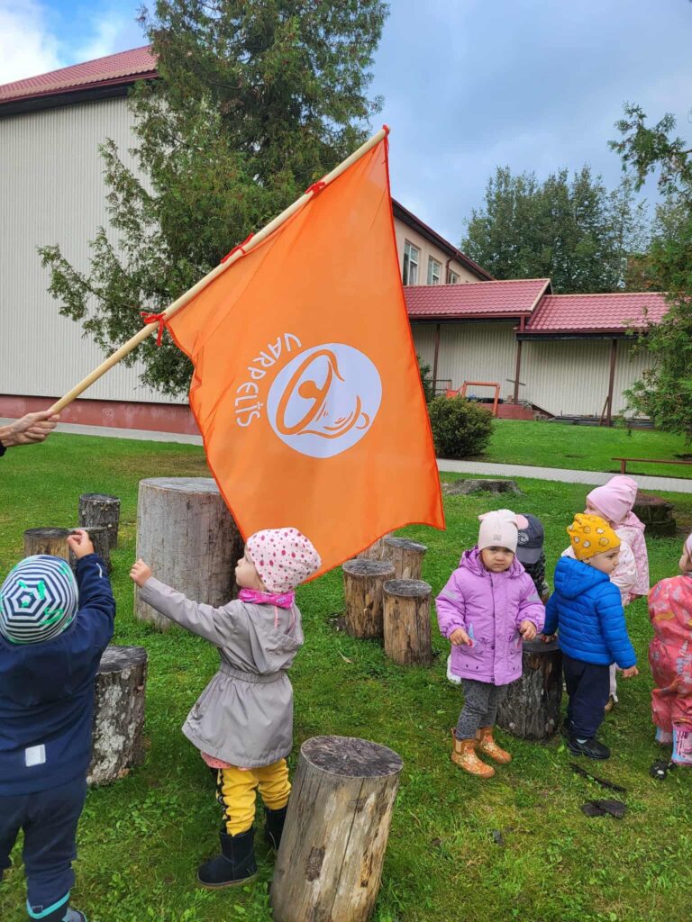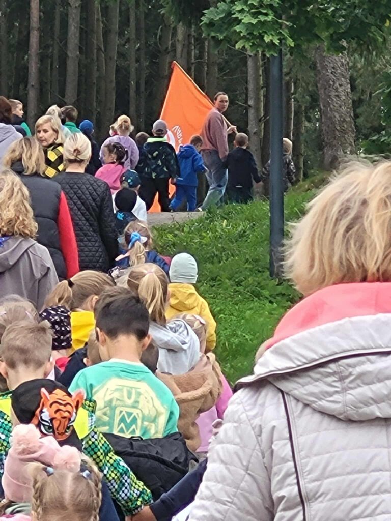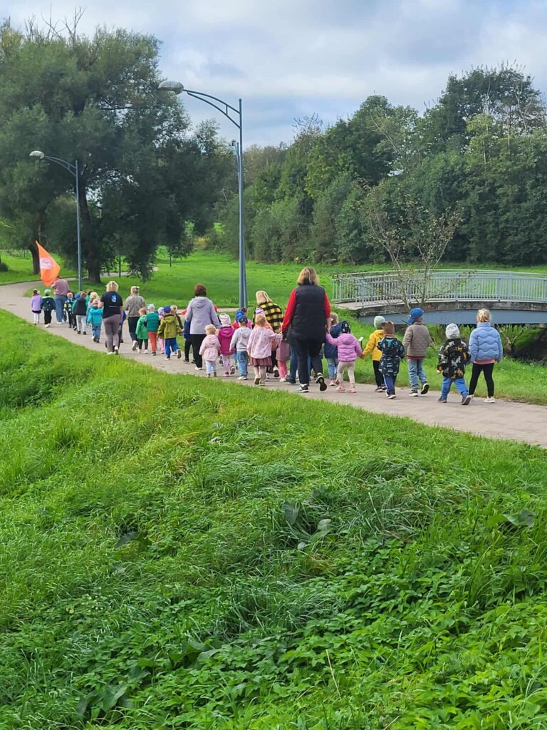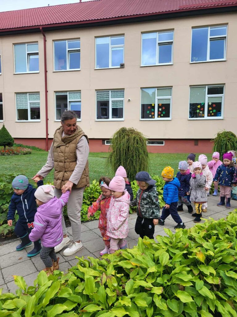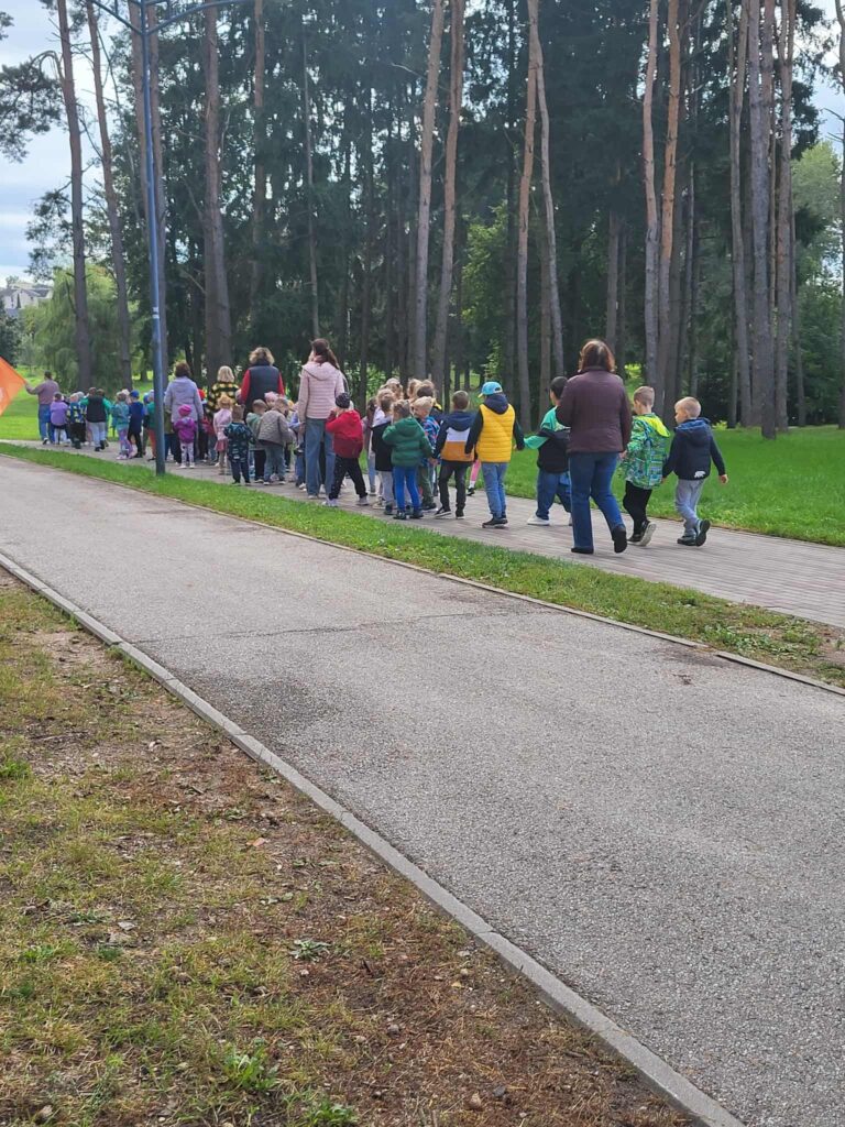 Trečiadienis – pėsčiųjų žygių diena; mažiausieji keliavo darželio kieme, o didesnieji – miesto Vyžuonos parke. Savo žygį pavadinome „Mes galim viską“. Išmokome žygio skanduotę, atlikome aktyvią mankštą ir, padavę draugui ranką bei mojuodami darželio vėliava, smagiai keliavome parko takeliais.