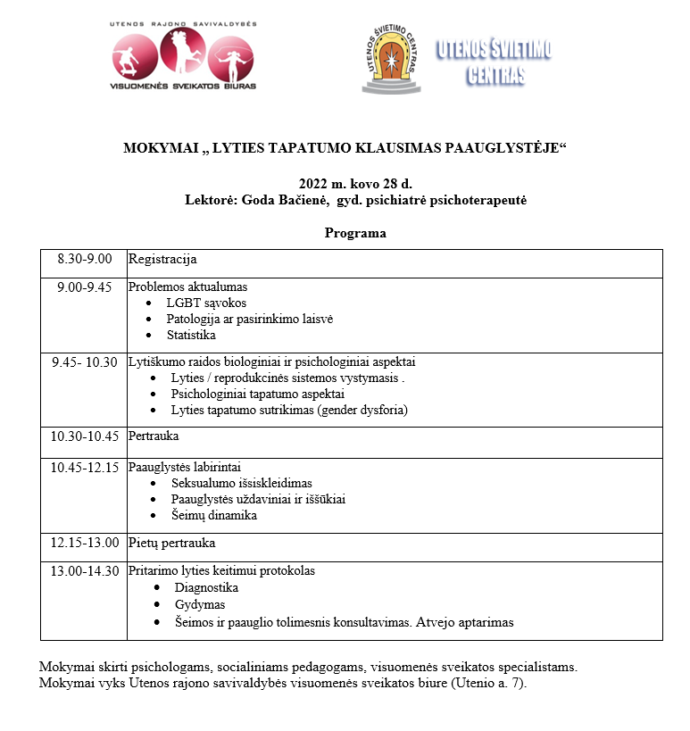 MOKYMŲ ,, LYTIES TAPATUMO KLAUSIMAS PAAUGLYSTĖJE“ PROGRAMA. REGISTRACIJA NEBEVYKDOMA