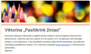 Pasibaigė viktorina mitybos, traumų profilaktikos ir užkrečiamųjų ligų temomis. Viktorinoje dalyvavo 296 asmenys. Teisingai į visus klausimus atsakė 35 uteniškiai ... Skaityti Toliau