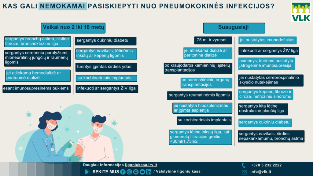 Pasak jos, vieną kartą gyvenime pneumokokinės infekcijos vakcina nemokamai skiepijami žmonės, kuriems yra didžiausia grėsmė ja susirgti ir turėti komplikacijų. Vieni iš jų – sunkiomis lėtinėmis ligomis sergantys vaikai nuo 2 metų ir suaugusieji, įrašyti į rizikos grupių sąrašą. Pavyzdžiui, dializuojami ligoniai, sergantieji onkologinėmis, reumatinėmis ligomis, kiti – 75 metų ir vyresni gyventojai.