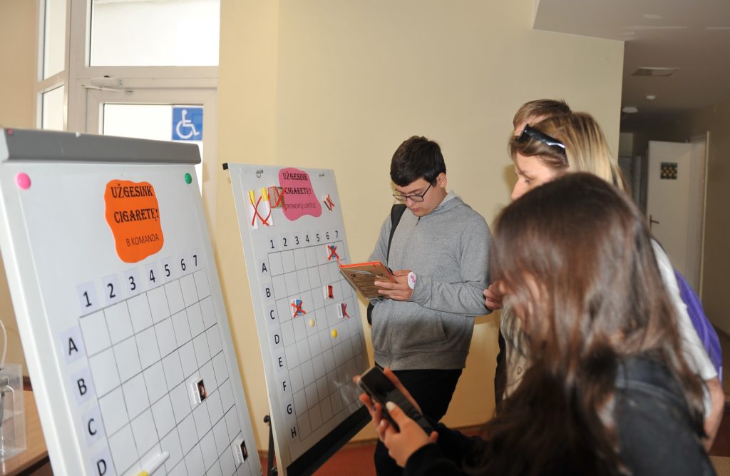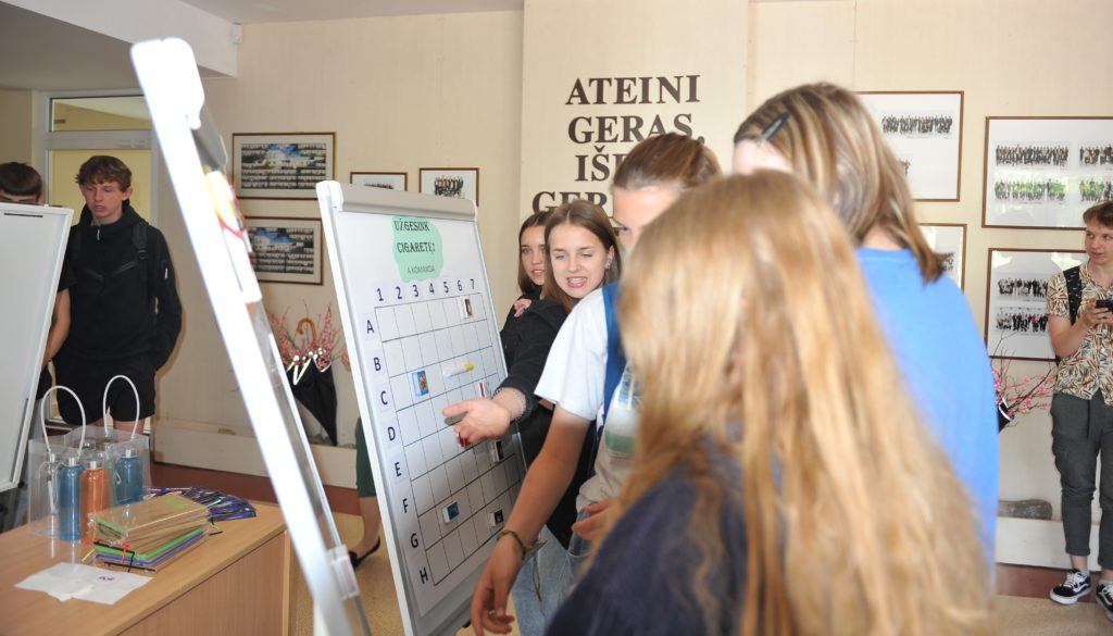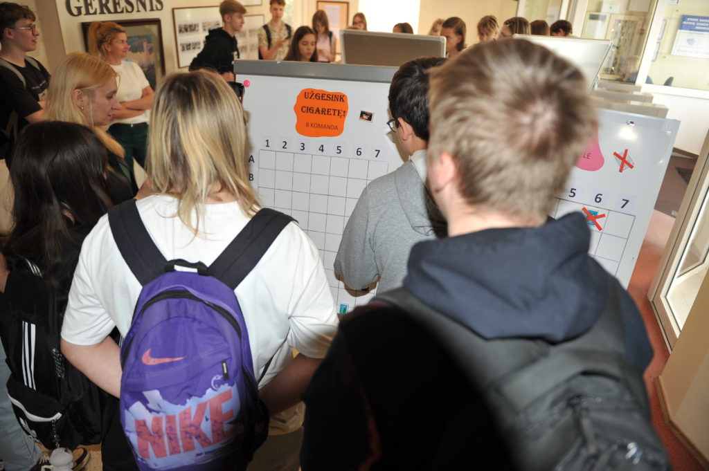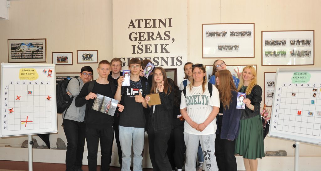 Gegužės 31 diena – Pasaulinė diena be tabako. Ši kasmetinė diena informuoja visuomenę apie nikotino vartojimo keliamus pavojus, kas yra daroma kovojant su tabako epidemija ir ką žmonės visame pasaulyje gali padaryti, kad labiau rūpintųsi sveikata. Siekiant paskatinti jaunimą, atsisakyti šio žalingo įpročio, visuomenės sveikatos specialistė Kristina Jasiūnienė, biologijos mokytojas Mindaugas Pranskūnas ir socialinė pedagogė Laura Peršonienė visus gimnazistus pakvietė pažaisti  „Užgesink cigaretę!“ tam, kad vietoje žalingo tabako vartojimo įpročio rinktųsi sveikatai naudingą veiklą. Galime pasidžiaugti buvo suburtos gimnazistų komandos, kurios varžėsi tarpusavyje, o azartas liejosi per kraštus. Kiekviena komanda siekė kuo greičiau ir kuo daugiau užgesinti kitų komandų cigaretes, o taip pat ir degtukus. Mokiniams patiko negailestingai triuškinti nikotino draugus ir parodyti gerą pavyzdį draugams.