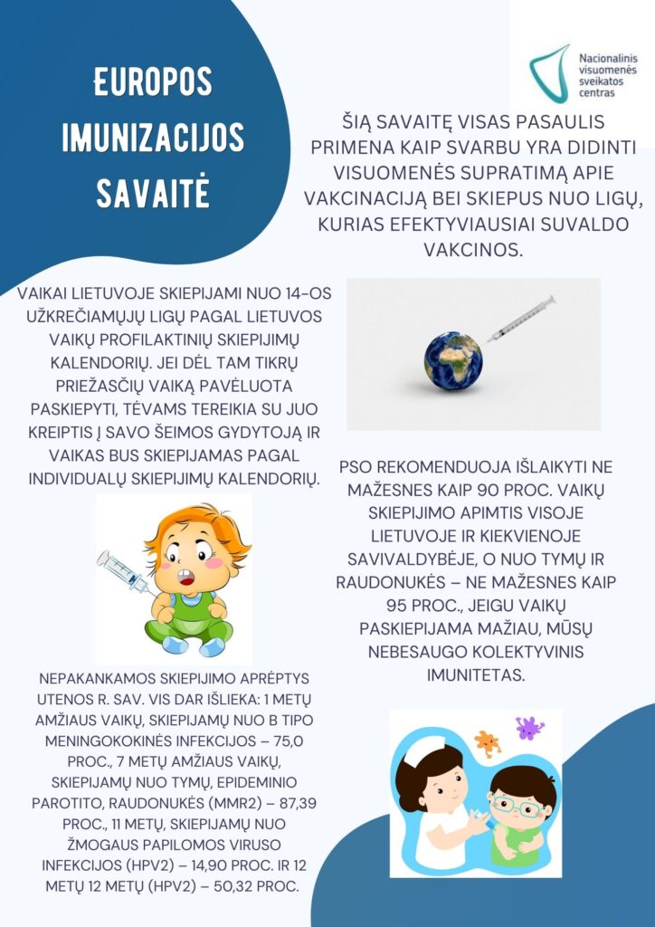 Paskutinę balandžio savaitę kasmet minima Europos imunizacijos savaitė, kurios metu siekiama didinti visuomenės supratimą apie imunizacijos svarbą ligų prevencijai ir gyvybės apsaugai.