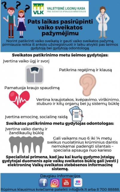 „Norint patikrinti vaiko sveikatą ir gauti vaiko sveikatos pažymą, pirmiausia reikia iš anksto užsiregistruoti ir laiku atvykti pas šeimos gydytoją bei gydytoją odontologą. Vaiką iki 16 metų turi lydėti vienas iš tėvų arba globėjų, kitaip gydytojas negalės patikrinti vaiko sveikatos būklės, nes nebus raštiško tėvų arba globėjų sutikimo”, – teigė VLK atstovė Jurgita Grigarienė.