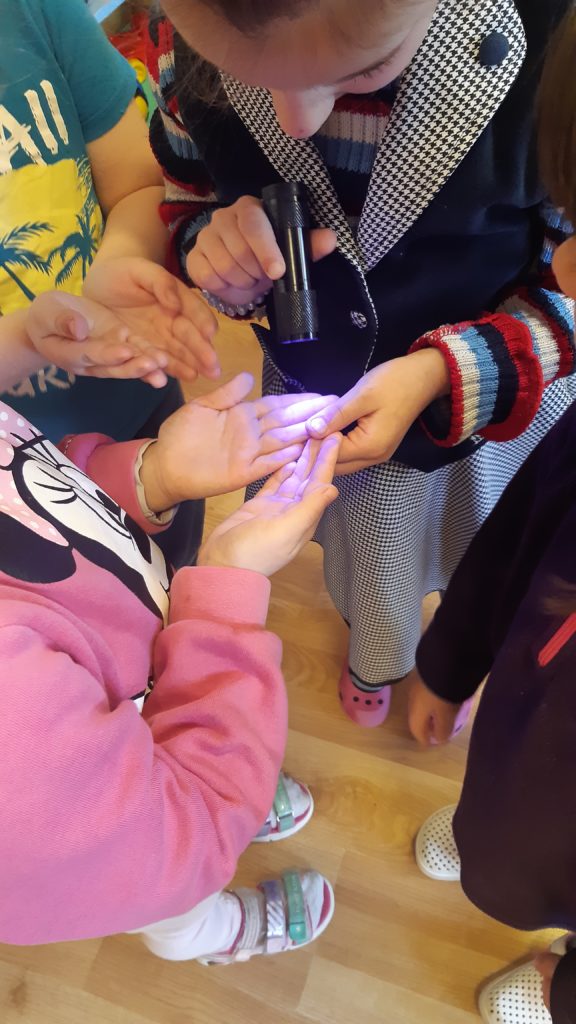 Kovo 15 d. Utenos r. Užpalių gimnazijos Vyžuonų skyriaus ikimokyklinėje grupėje kilo šurmulys: vaikučiai mokėsi švarių rankų taisyklių. Pirmiausia pasitikrino ar švarūs delniukai, nukarpyti nagučiai, paveikslėliuose matė kaip atrodo mikrobai, prisiminė kada būtina plauti rankutes, kaip teisingai tai padaryti. Ultravioletinių spindulių lempa tikrino, ar tikrai išmoko švarių rankų taisykles. Pasirodo, švariai nusiplauti rankutes nelengva, kai kam teko pamoką pakartoti! Už pastangas vaikai apdovanoti spalvotais rankšluostukais.