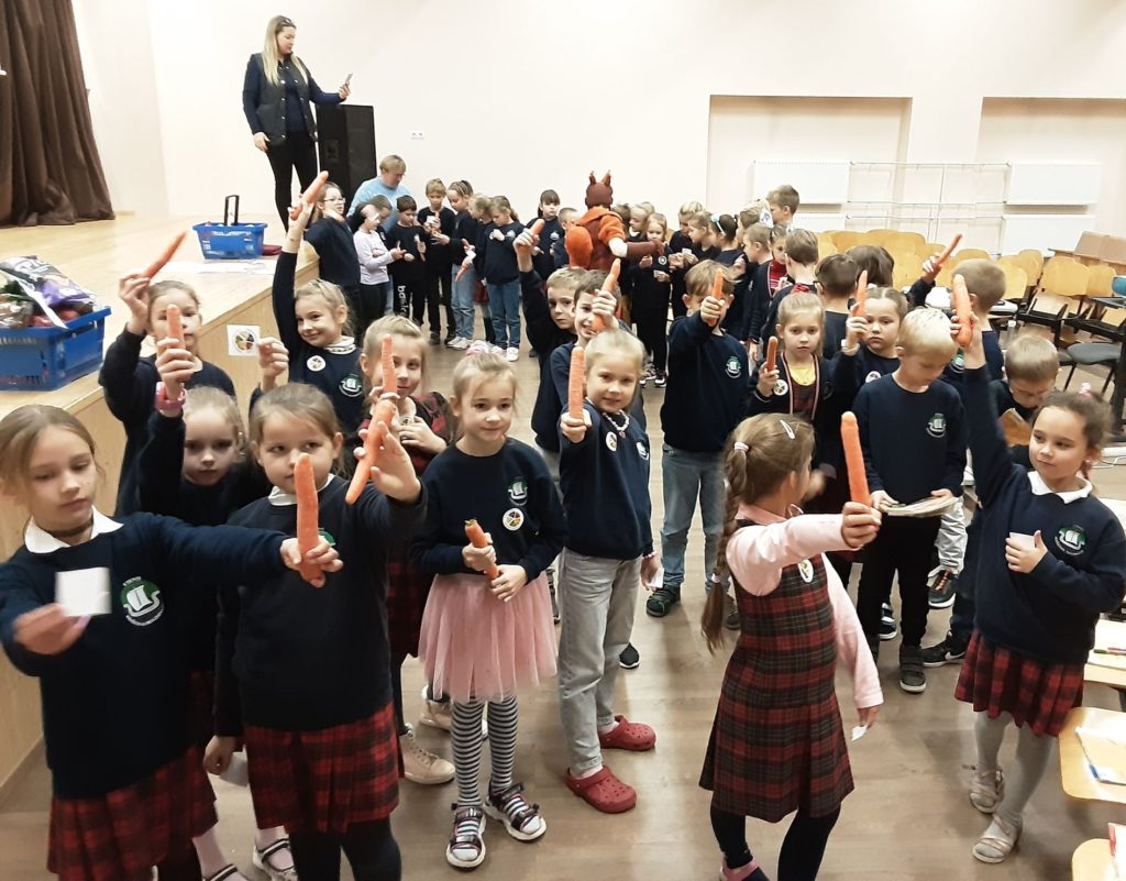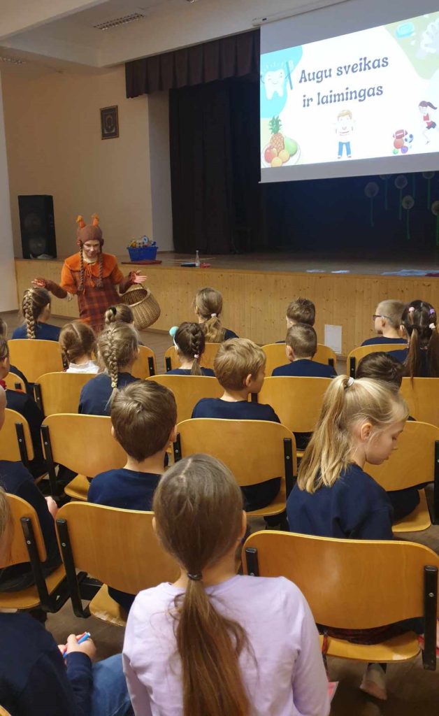 Lapkričio 16 d. Utenos Krašuonos progimnazijoje vyko sveikatinimo renginys ,,Augu sveikas ir laimingas“. Jame dalyvavo visi antrų klasių ir ,,Versmės“ skyriaus mokiniai. Šio renginio tikslas – žaismingomis priemonėmis priminti veiksnius, kurie saugo ir stiprina mūsų sveikatą kiekvieną dieną. Viktorinos metu ,,Voverytė“ domėjosi, ką vaikai žino apie dantų priežiūrą, žalingus įpročius, saugų eismą, sveikatai palankią mitybą. Vėliau vaikai turėjo galimybę įtvirtinti sveikos gyvensenos žinias atlikdami praktines užduotis. Pertraukėlės metu nepamiršome pasimankštinti, juk fizinis aktyvumas neatsiejama sveikos gyvensenos dalis. Už puikias žinias ir aktyvų dalyvavimą visi vaikai gavo lipdukus ir vitaminų akims bei odai – morkų.