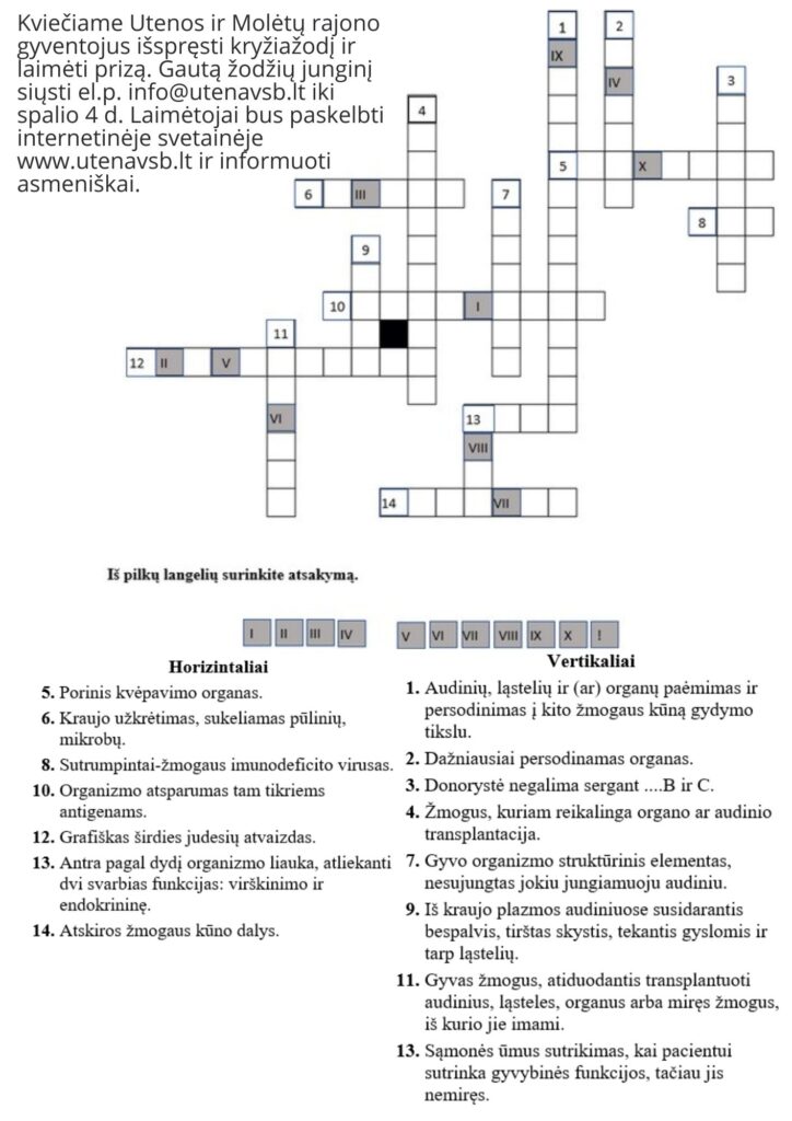 Taip pat kviečiame Utenos ir Molėtų rajono gyventojus išspręsti kryžiažodį ir laimėti prizą. Gautą žodžių junginį siųsti el.p. info@utenavsb.lt iki spalio 4 d. Laimėtojai bus paskelbti internetinėje svetainėje www.utenavsb.lt ir informuoti asmeniškai.