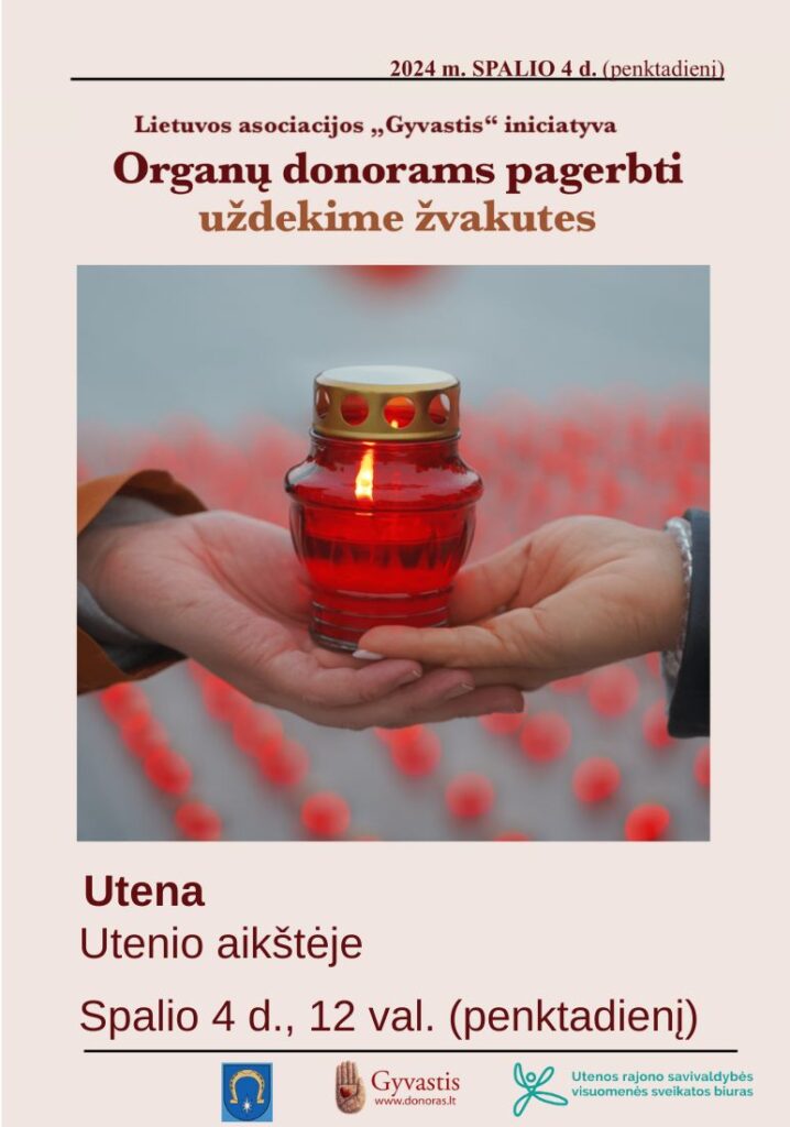 Spalis – Europos organų, audinių ir ląstelių donorystės mėnuo. Lietuvoje visą spalio mėnesį organizuojami įvairūs renginiai ir rengiamos akcijos. Utenos rajono savivaldybė, Utenos rajono savivaldybės visuomenės sveikatos biuras kviečia spalio 4 d. 12 val. pagerbti organų donorus, uždegant žvakutes Utenio aikštėje.