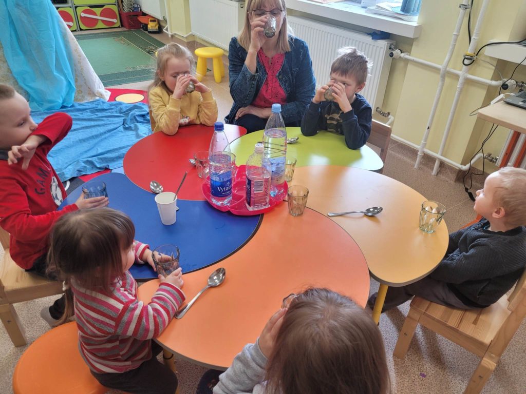 Kovo 22 dieną Utenos r. Užpalių gimnazijos ikimokyklinės „Boružiukų“ grupės vaikai pasigamino vandens krioklį. Kaip gera tyrame vandenyje pasipliuškenti rankytėmis ir įmerkti kojas! Visai nesmagu, kai ten plūduriuoja šiukšlės… Vaikai sužinojo, kokį vandenį galima gerti, kiek ir kur jo yra žemėje , kaip jis patenka į mūsų namus ir kodėl vandenį turime taupyti ir saugoti. Ragavome visokių rūšių vandens: sūraus jūros, kuris nemalšina troškulio, gazuoto ir negazuoto mineralinio, kuris patiko ne visiems, stalo iš parduotuvės ir Krokulės šaltinio. Vieningai nutarėme: skaniausias vanduo yra iš krano ąsotyje, kur plauko citrinos gabalėliai!