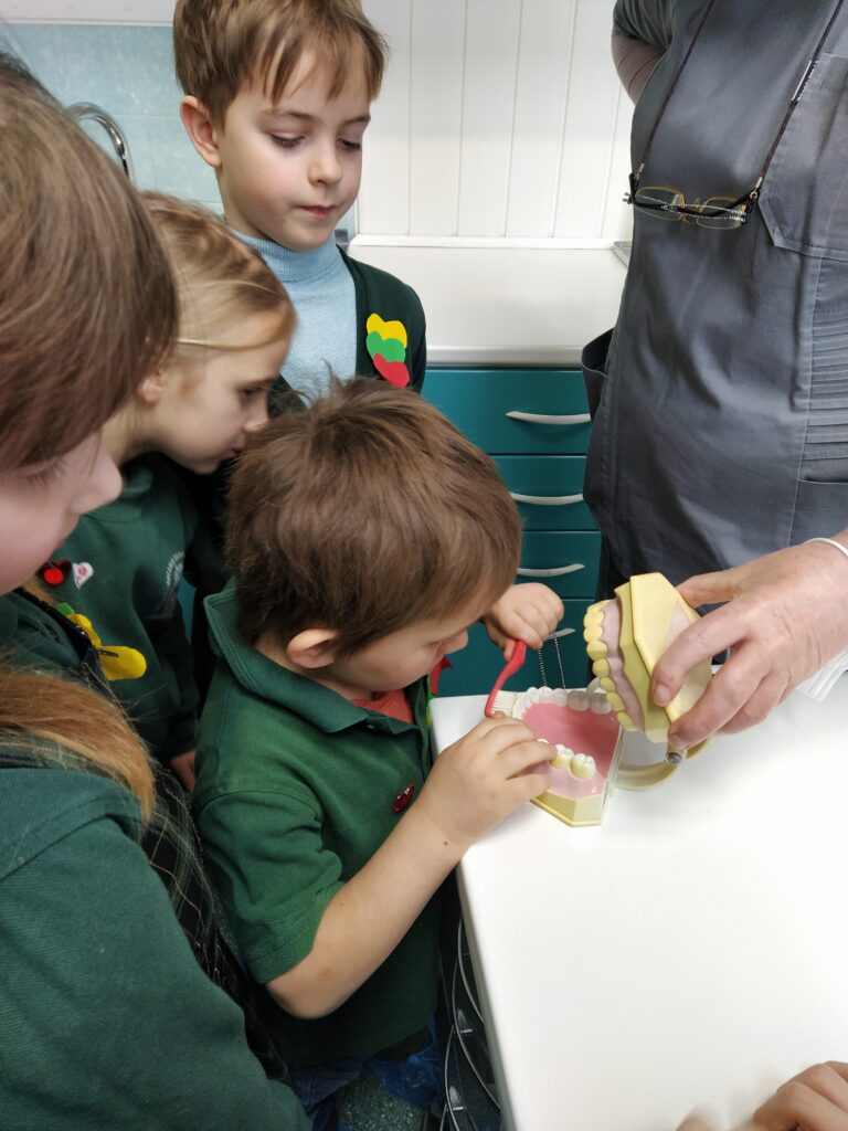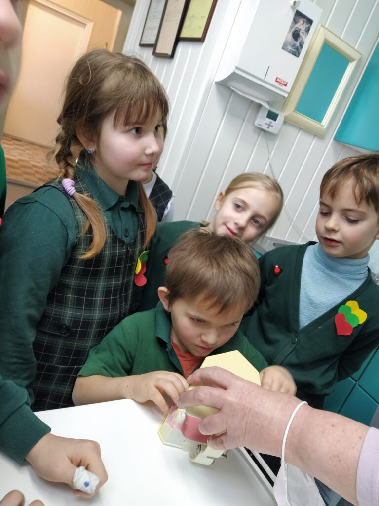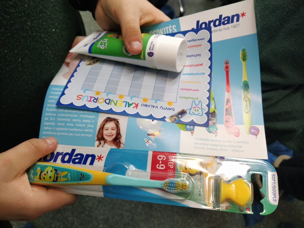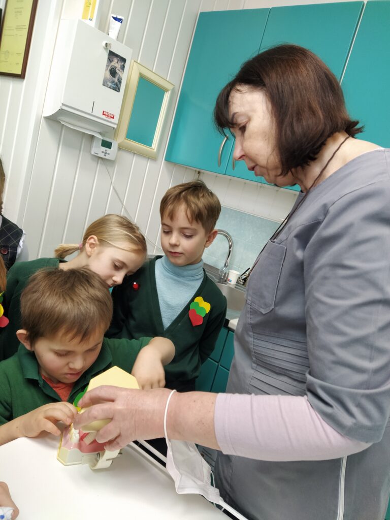 Vasario 14 d. Molėtų r. Giedraičių Antano Jaroševičiaus gimnazijos pirmos klasės mokiniai, kartu su visuomenės sveikatos specialiste, vykdančia sveikatos priežiūrą mokykloje ir klasės vadove Jolanta,  lankėsi Giedraičių ambulatorijoje, gyd. Linos Rimavičienės odontologijos kabinete. Gydytoja papasakojo vaikams apie dantų anatomiją, priminė, kaip taisyklingai reikia valyti dantukus ir kokio maisto reikėtų vengti.  Pirmokai klausėsi, uždavinėjo rūpimus klausimus gydytojai odontologei. Mokiniai į mokyklą grįžo nešini dantų valymo kalendoriais, naujais dantų šepetukais ir dantų pasta bei davę gydytojai pažadą dantis valyti ryte ir vakare.