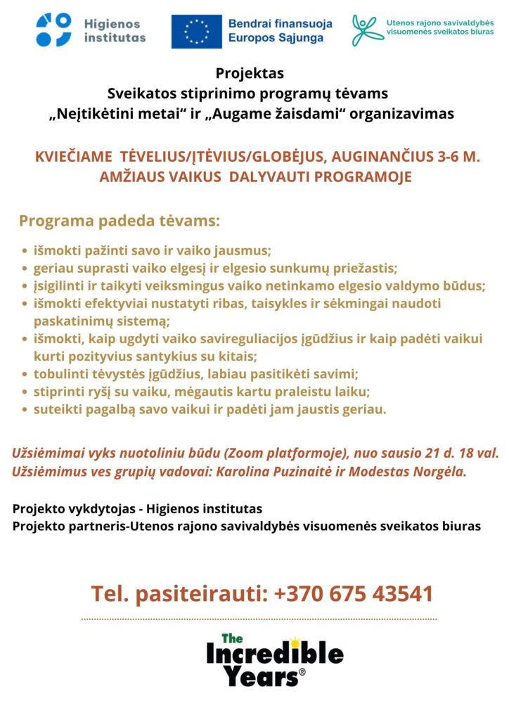 Stiprinti pozityvios tėvystės įgūdžius, įgyvendinant Neįtikėtinų metų (angl. Incredible Years) ir Augame