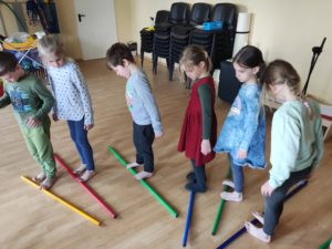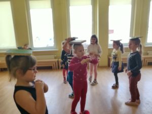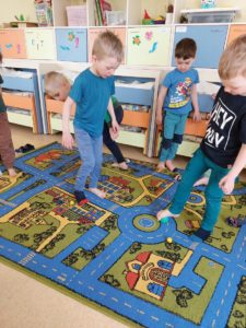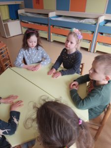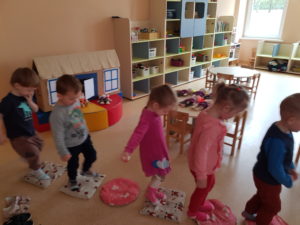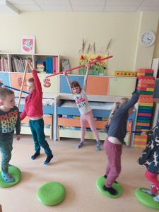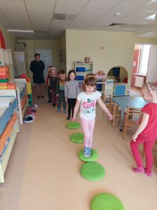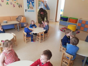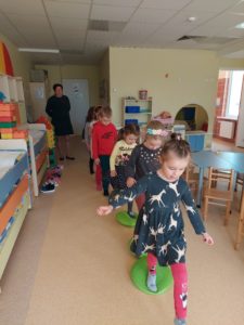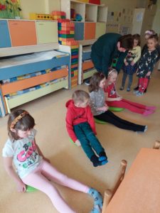 Grupėse lankėsi visuomenės sveikatos priežiūros specialistė Žydrūnė, ji vaikams parodė pratimus taisyklingos laikysenos gerinimui, pamokė taisyklingo sėdėjimo prie stalo, įvertino vaikams skirtų baldų atitikimą pagal vaikų ūgį bei amžių.