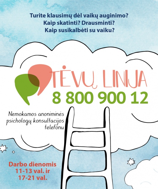 „Tėvų linija“ – anoniminės psichologų konsultacijos telefonu, nemokamu numeriu 8 800 900 12, darbo dienomis 11 – 13 val. ir 17 – 21 val. Tai Prezidentės Dalios Grybauskaitės inicijuotos kampanijos „Už saugią Lietuvą“ dalis, finansuojama Socialinės apsaugos ir darbo ministerijos lėšomis, įgyvendinama VšĮ „Paramos vaikams centras“. Daugiau informacijos – www.tevulinija.lt