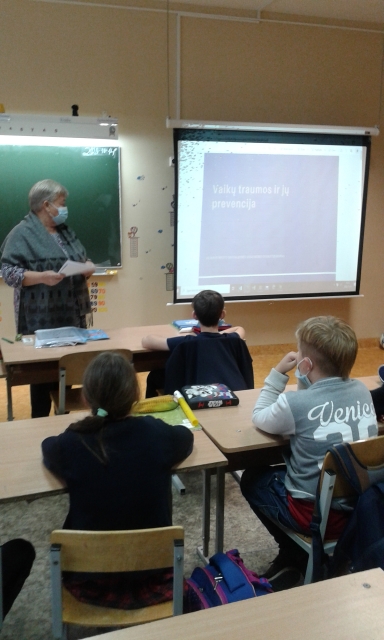 Š. m. spalio mėn. ketvirtų klasių moksleiviams pravestos pamokos ,,Traumos ir jų prevencija”. PSO skelbia, jog ,,Vaikų sužalojimai – tai svarbiausia visuomenės sveikatos problema, kuriai reikia teikti ypatingą dėmesį”. Higienos instituto duomenimis Lietuvoje per metus nuo sužalojimų miršta apie 400 vaikų ir paauglių, tad ši tema labai aktuali. Pamokos metu buvo kalbama apie dažniausiai pasitaikančias vaikų traumas, pagrindines priežastis, kodėl vaikai patiria sužalojimus, kas yra sužalojimas, kaip teikti pirmąją pagalbą. Moksleiviai prisiminė savo gyvenime patirtas traumas, nelaimingus atsitikimus. Žinias įtvirtinti padėjo mokomosios knygelės ,,Pirmoji pagalba”. Vaikai atliko knygutėje pateiktas užduotis, analizavo ir aptarė situacijas.