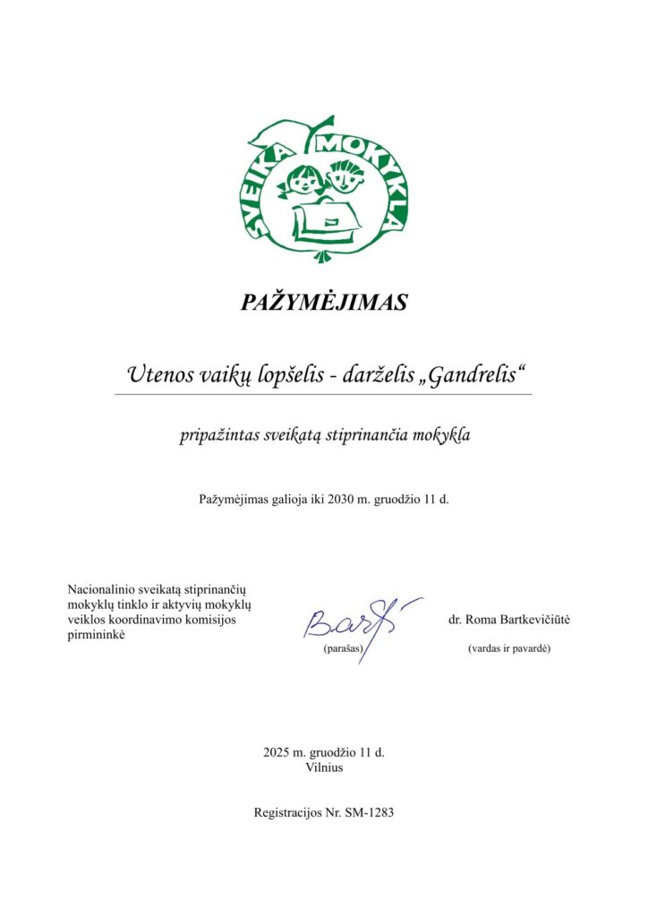 Utenos vaikų lopšelis-darželis „Gandrelis“ , siekdamas stiprinti mokinių ir kitų mokyklos bendruomenės narių fizinę, protinę, dvasinę sveikatą ir integruodamas aktyvias veiklas į kasdienį darželio gyvenimą, parengė programą: „Gandreli, parodyk sveikatos takelį“. 2025 m. gruodžio 11 d. Nacionalinio sveikatą stiprinančių mokyklų tinklo ir aktyvių mokyklų veiklos koordinavimo komisija aukštais balais įvertino įstaigos pateiktus dokumentus ir priėmė sprendimą Utenos vaikų lopšelį-darželį „Gandrelį“ pripažinti „Sveikatą stiprinančia mokykla“.