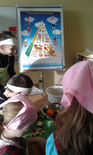 Vasario mėnesį visos dienos mokyklėlės 3-4 klasių mokiniams visuomenės sveikatos priežiūros specialistė I. Paukštienė pravedė sveikatinimo veiklą ,,Vaikai ir sveika mityba: ar įmanoma susidraugauti?”. Jų metu diskutavome, kodėl reikia kalbėti apie sveiką mitybą, prisiminėme sveikatai palankios mitybos pagrindinius principus, nagrinėjome sveikos mitybos piramidę, svėrėme vaisių porciją, reikalingą suvalgyti vienam mokiniui per dieną, aiškinomės kuo galima pakeisti riebią mėsą, bandėme atpažinti žirnius, avinžirnius, lęšius. Kalbėjome apie cukraus žalą organizmui. Dalinomės įspūdžiais apie vaikų maitinimosi patirtį, parsivežtą iš mokyklų bei darželių Švedijoje, Anglijoje. Po to mokiniai ruošė vaisių salotas iš namų atsineštų vaisių. Visi valgėme paruoštas salotas ir džiaugėmės bendru kolektyviniu darbu.