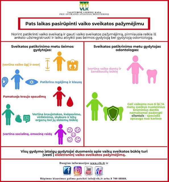 Valstybinės ligonių kasos prie Sveikatos apsaugos ministerijos (VLK) specialistai ragina tėvelius jau dabar pasirūpinti vaiko profilaktiniu sveikatos tikrinimu, nelaukiant naujų mokslo metų pradžios. Profilaktiškai tikrintis sveikatą ir apsilankyti pas savo šeimos gydytoją bei gydytoją odontologą privaloma visiems vaikams iki 18 metų. Nuo šiol duomenys apie vaiko sveikatos būklę tvarkomi elektroniniu būdu.