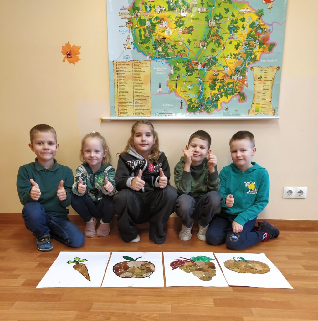 Mažieji vaikai, susipažinę su vaisiais ir daržovėmis, aptarę jų išvaizdą bei naudą, žaidė žaidimus, kūrė meninius darbelius.