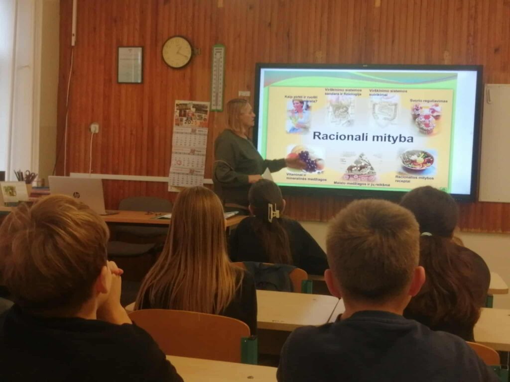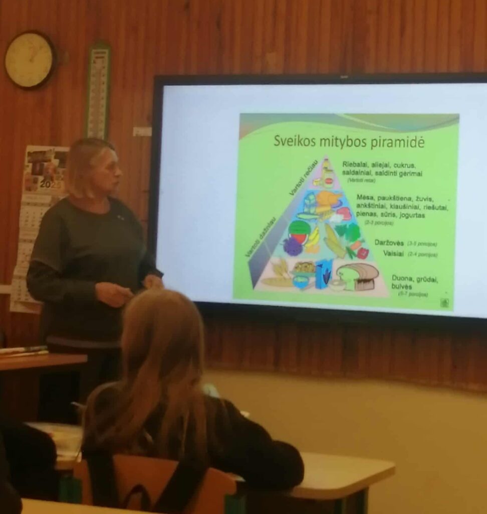 Vaisiai ir daržovės yra sveikatos ir vitaminų šaltinis. Jie padeda vaikams augti sveikiems ir žvaliems. Lapkričio mėnesį Molėtų progimnazijos 5b klasės mokiniams, Giedraičių Antano Jaroševičiaus gimnazijos priešmokyklinio ugdymo grupės ir 3 klasės mokiniams vyko pokalbiai-diskusijos – ,,Vaisių ir daržovių nauda vaikų organizmui“. Šių užsiėmimų tikslas – ugdyti sveikos mitybos įgūdžius, supažindinti su įvairių vaisių ir daržovių nauda ir vartojimo svarba.  Aiškindamiesi ir diskutuodami nagrinėjome sveiko maisto piramidę: kodėl piramidės viršūnėje esantys produktai turi būti vartojami rečiau bei mokėmės atskirti sveikus ir nesveikus produktus. Visuomenės sveikatos priežiūros specialistė kartu su mokiniais aptarė vaisių ir daržovių naudą jų augančiam organizmui. Mokiniai savo žinias pasitikrino atsakinėdami  į klausimus bei patys uždavė daug klausimų.