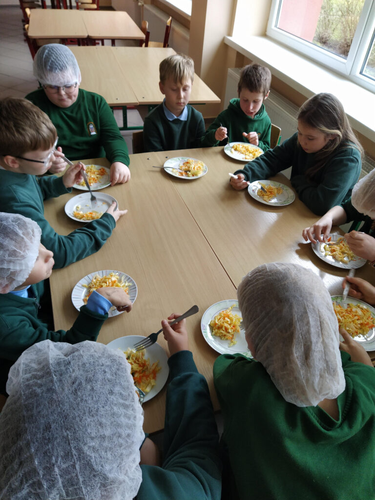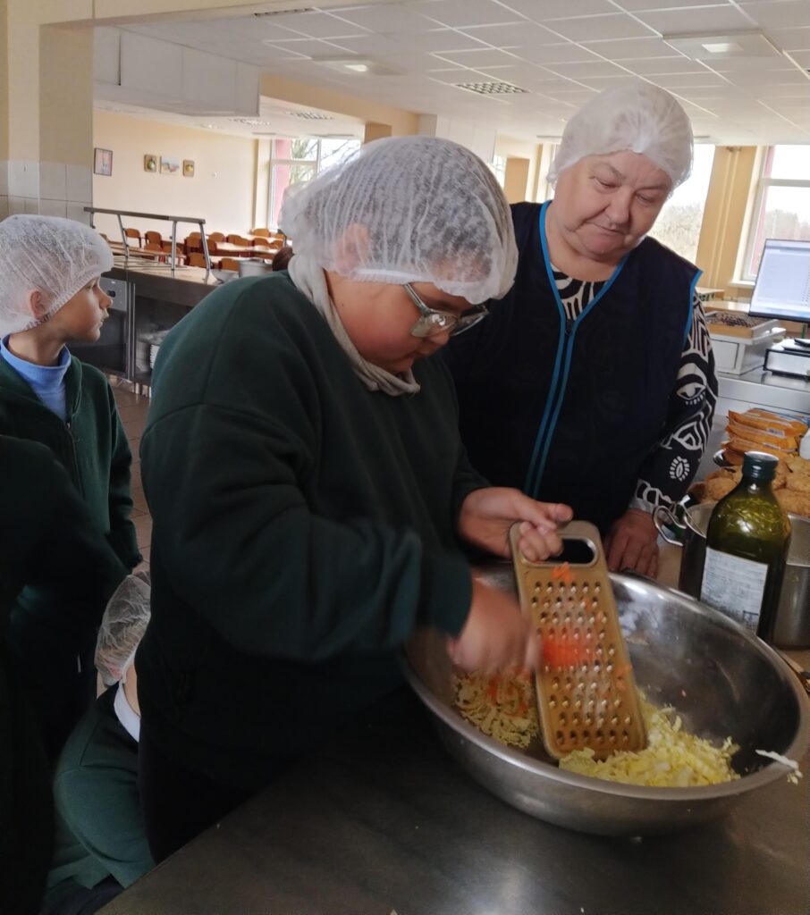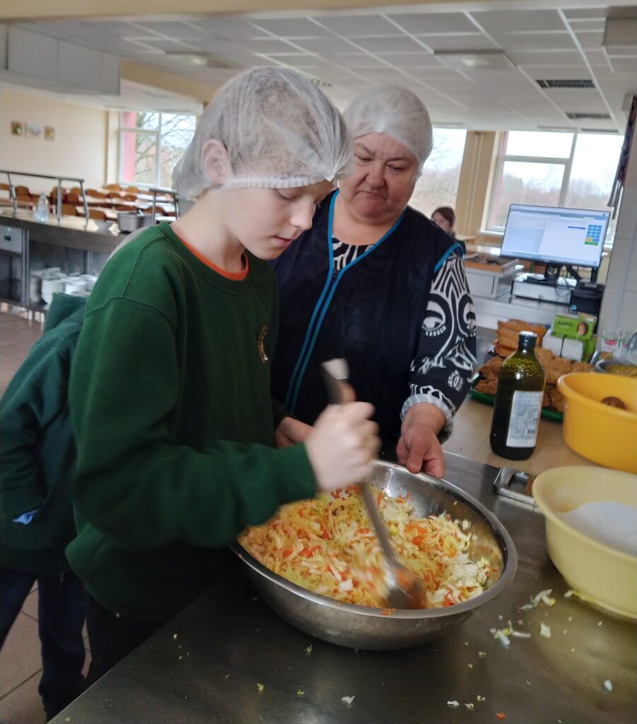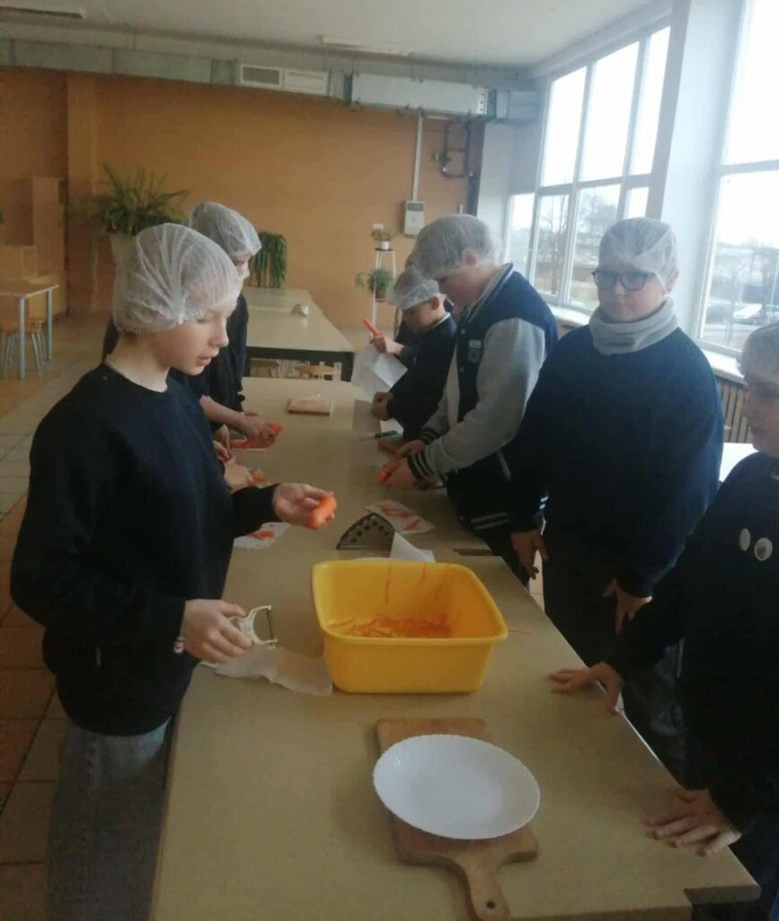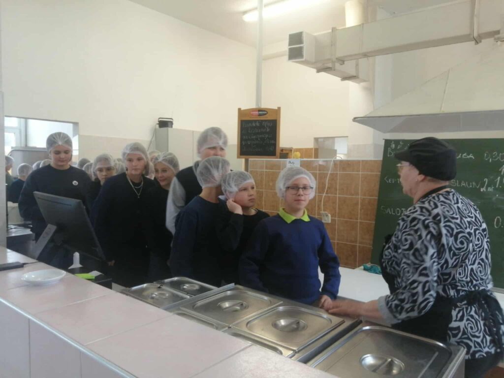 Trečiokai apsilankė Giedraičių Antano Jaroševičiaus gimnazijos valgykloje, o penktokai –Molėtų progimnazijos valgykloje kur pakalbėjo su virėjomis, domėjosi kaip vyksta mokinių maitinimo darbai, uždavė daug klausimų  bei susipažino su vaisiais ir daržovėmis iš arčiau gamindami sveikuoliškas salotas. Vieni skuto daržoves, kiti pjaustė ir tarkavo, dar kiti – maišė. O pagaminę – su malonumu jas suvalgė. Pasisotinę nutarė, kad reikia valgyti daugiau šviežių vaisių ir daržovių, nes tai yra labai naudinga.