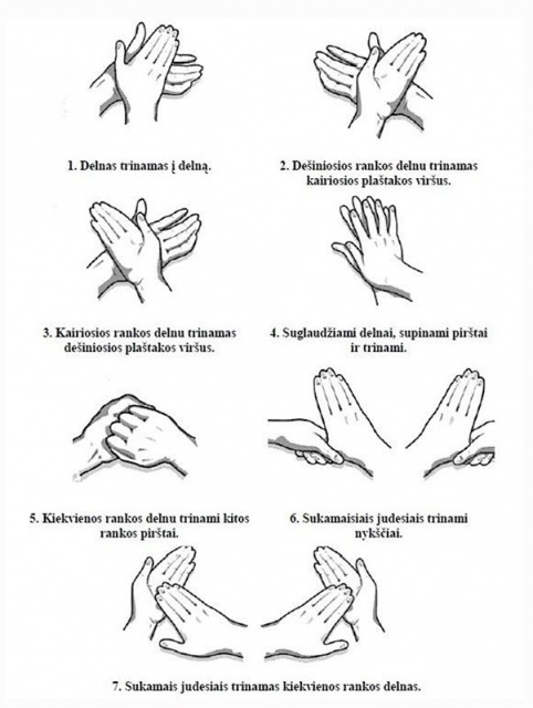 - Kartu su grupės draugais sukurkite iki 1 min. trukmės šokį, kuriame atsispindėtų rekomenduojami rankų plovimo ir kosėjimo judesiai. Juos rasite žemiau.